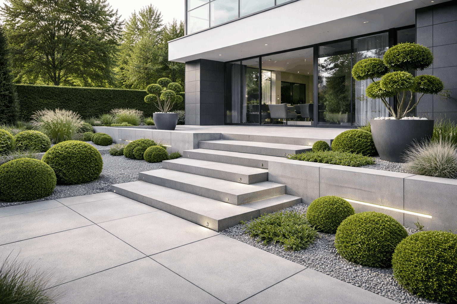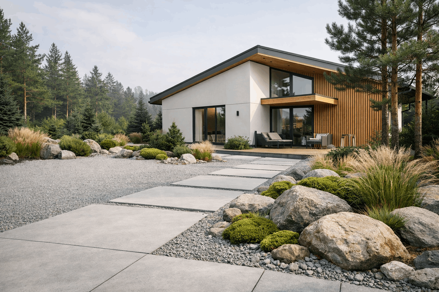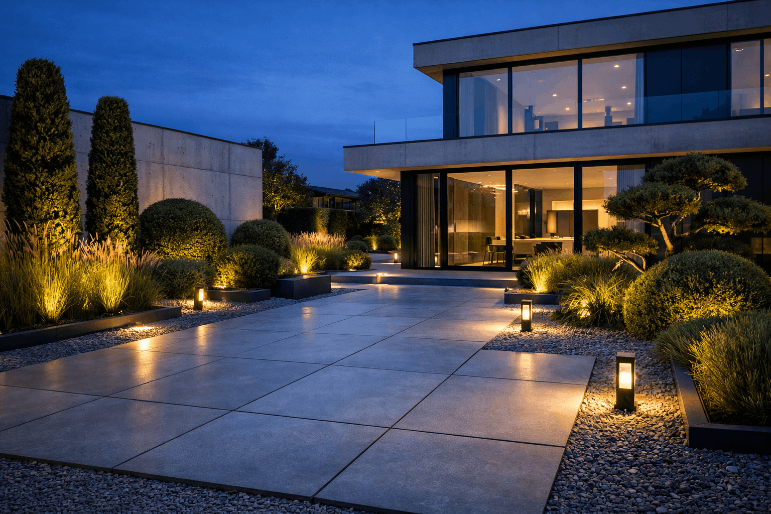Плитка/камень/бордюр, грунты, растения и свет — под стиль дома и условия (солнце, влажность, ветер).